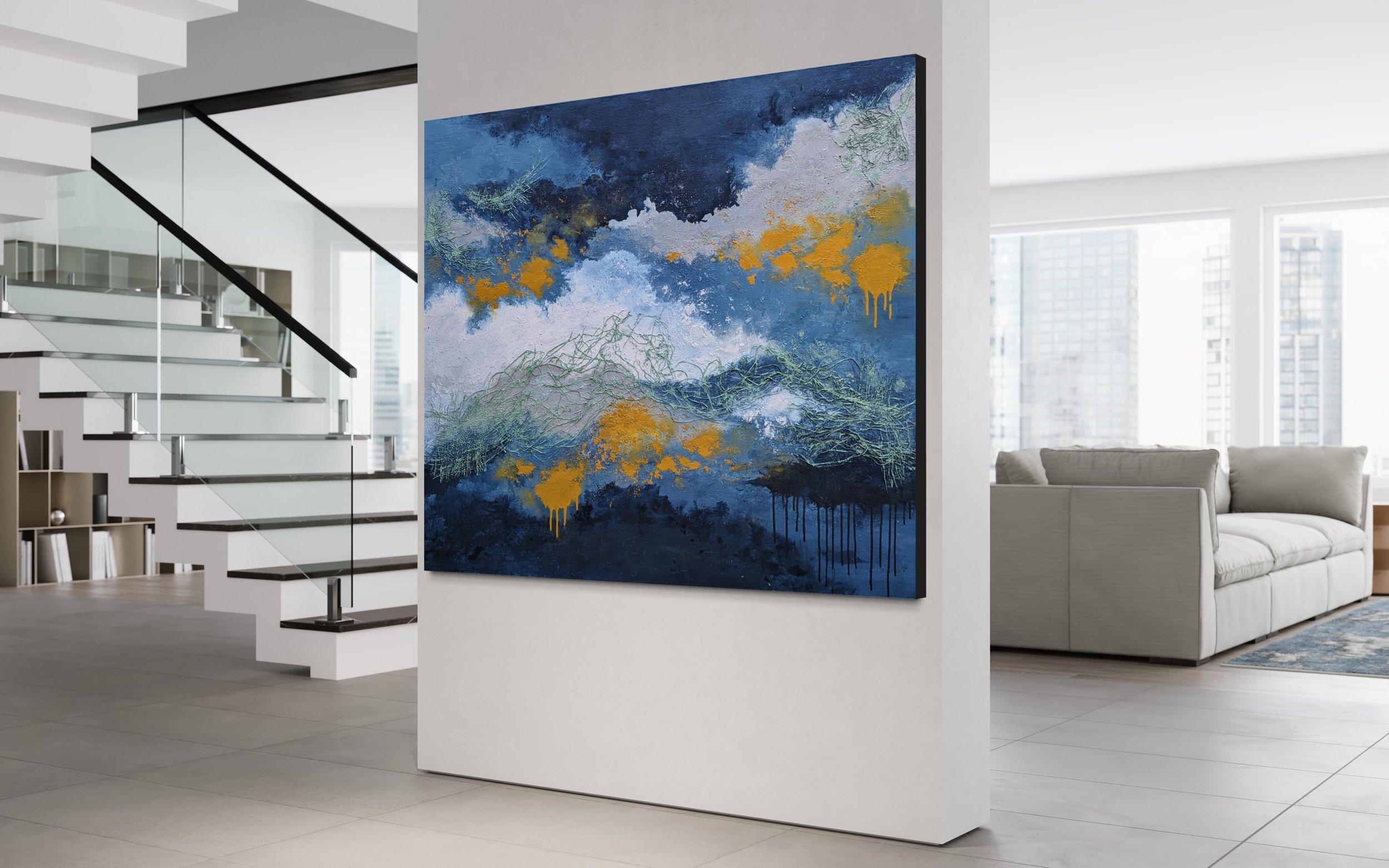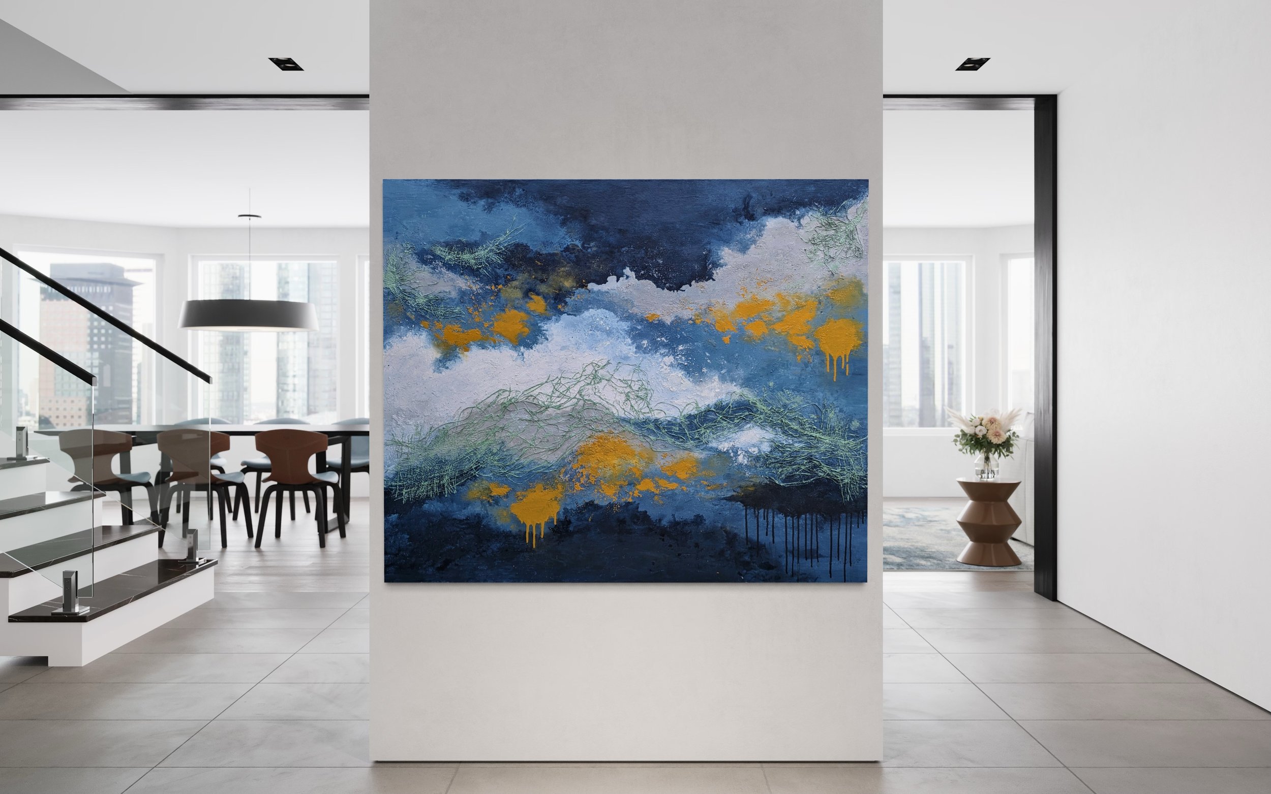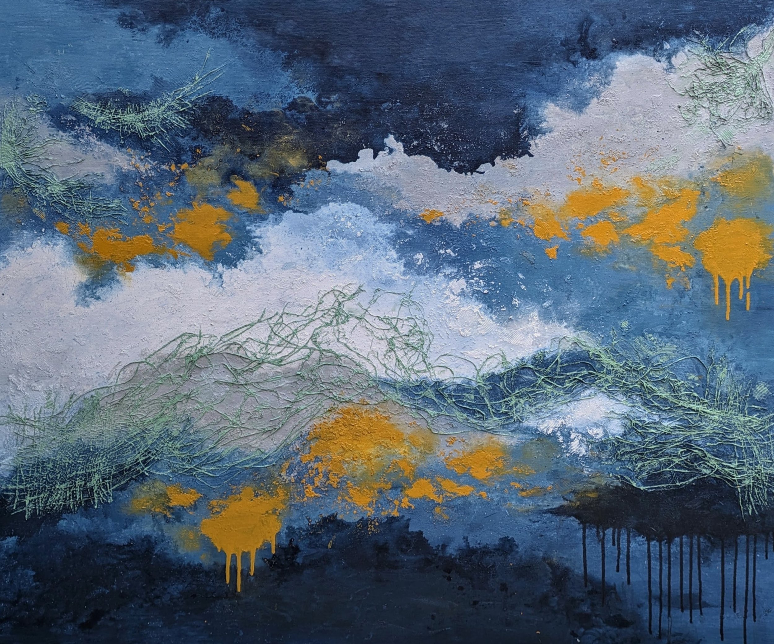 Created with acrylic paint, natural pigments as well as sand and reclaimed fishing rope