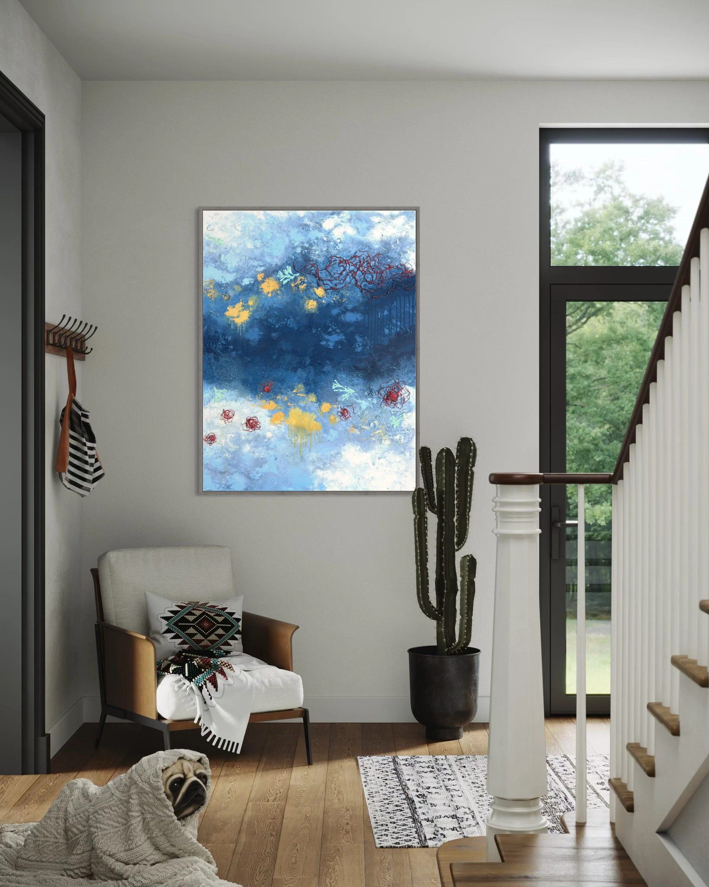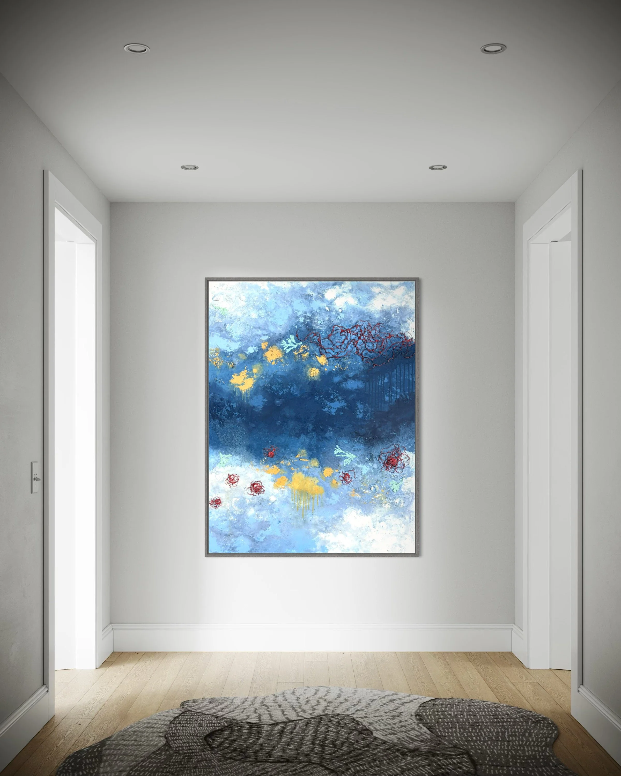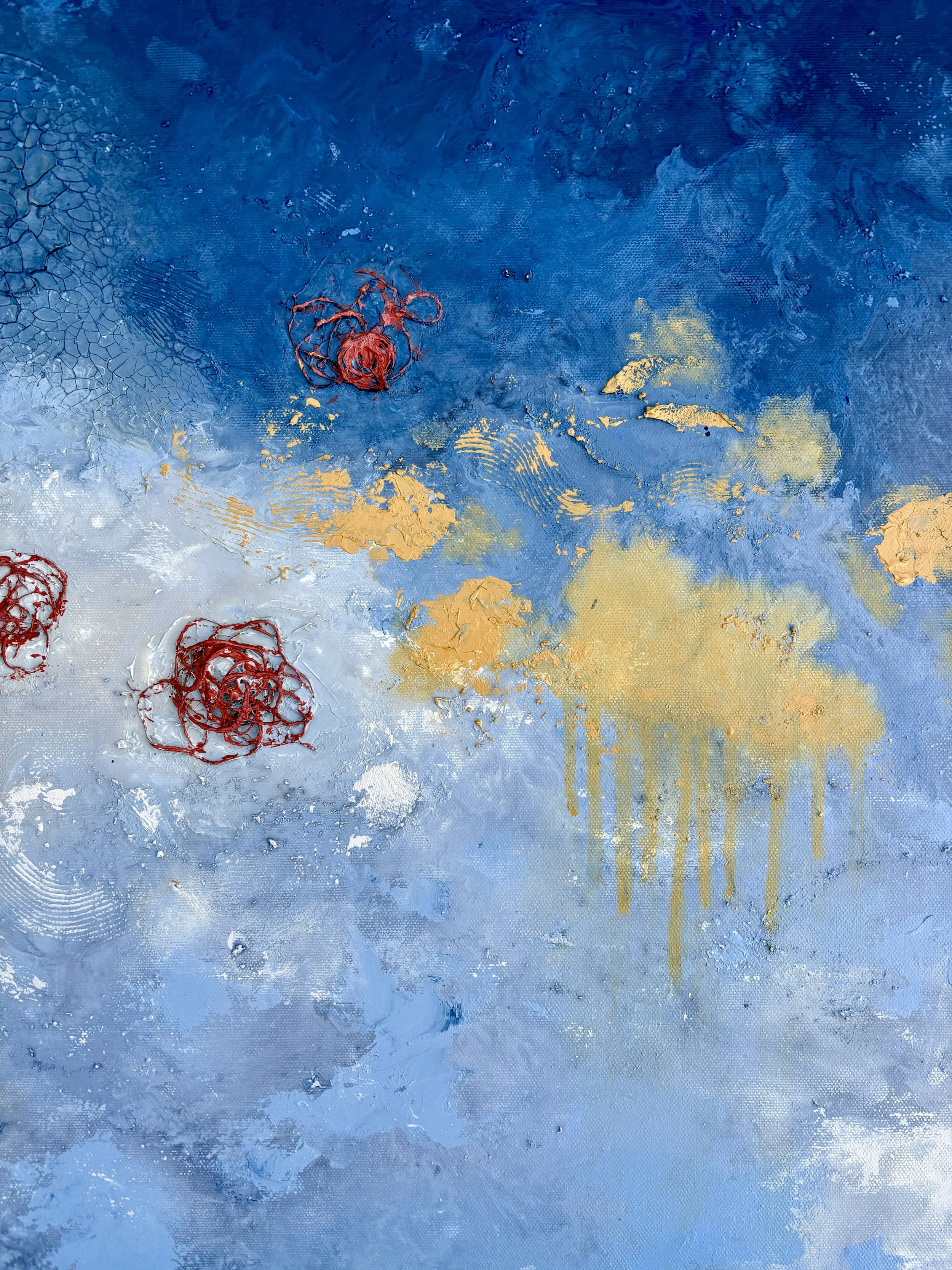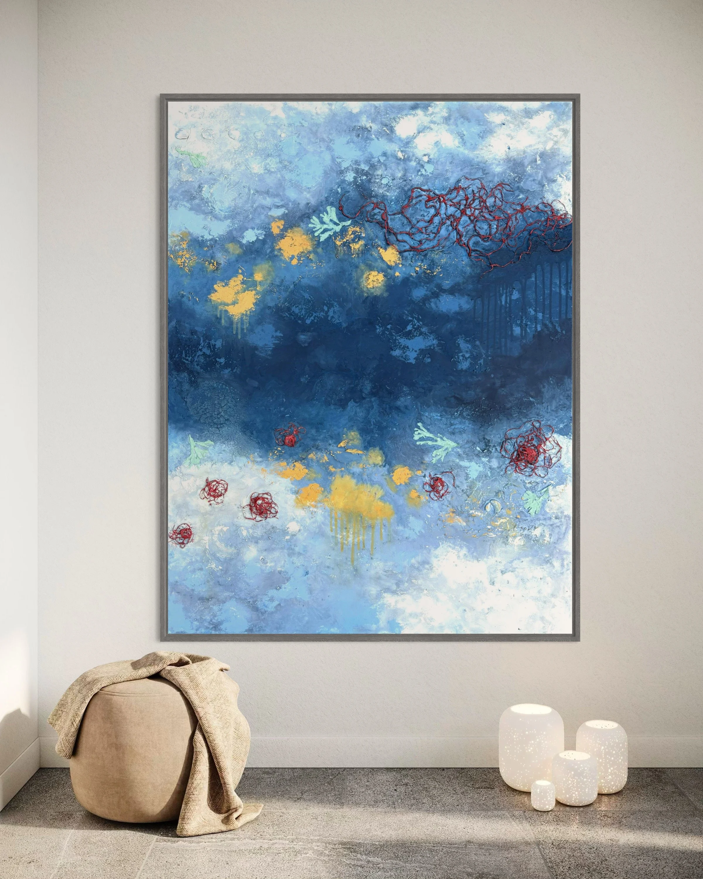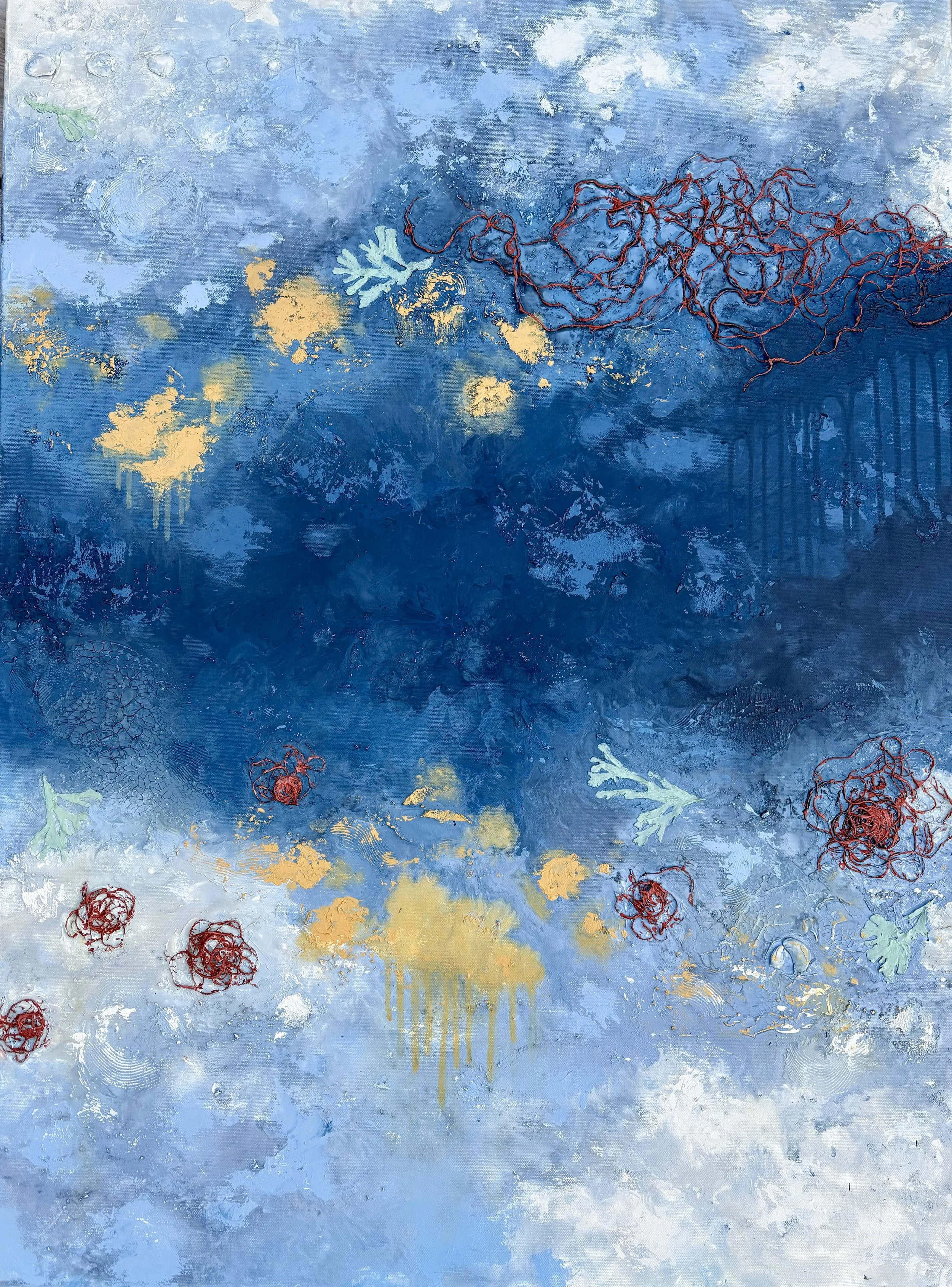 Created with acrylic paint, seashells, dried seaweed and reclaimed fishing rope