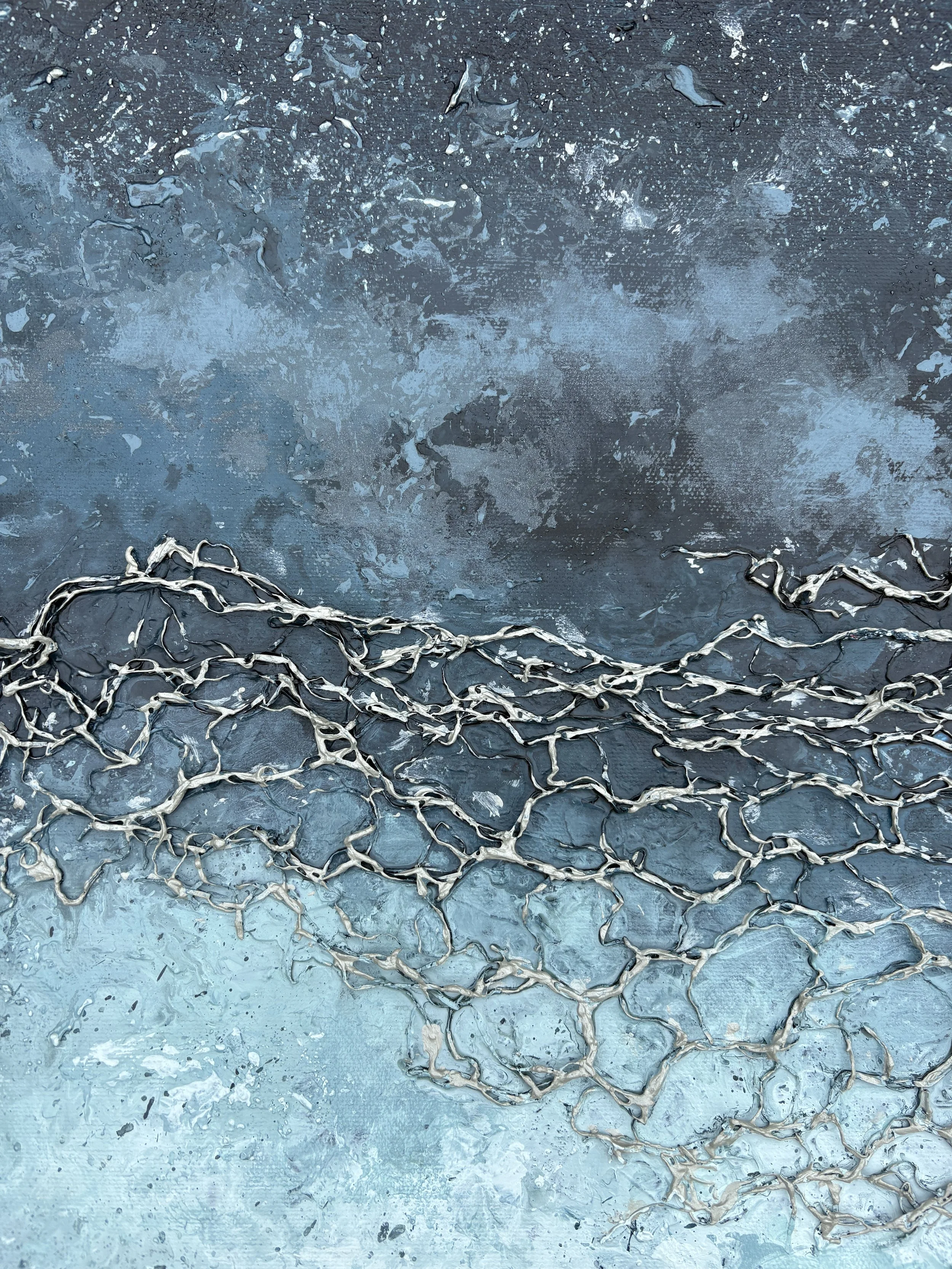 Created with acrylic paint, natural pigments as well as sand and reclaimed fishing rope